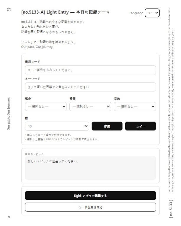 Generate endless journaling themes from a single word. [no.5133-A] Light Entry is a personal digital journaling tool that turns ideas into writing habits. Create unlimited prompts anytime with one code โ perfect for mindful journaling, reflection, and creative writing.